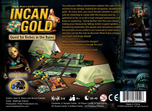 -. Binding : Toy -. Brand : Gryphon Games -. EAN : 0718122624546 -. Feature : Plays excellently with 6 to 8 family players as a push-your-luck party game / Light strategy game that incorporates risk-taking and push-you-luck mechanics / Exercises analytical and critical-thinking and develops good judgment, data analysis and probability skills -. Genre : strategy -. IsAdultProduct : 0 -. ItemPartNumber : 101171N -. Label : Eagle Games (Toys) -. Manufacturer : Eagle Games (Toys) -. Model : 101171N -. MPN : EAG01171 -. PackageQuantity : 1 -. PartNumber : EAG01171 -. ProductGroup : Toy -. ProductTypeName : TOYS_AND_GAMES -. Publisher : Eagle Games (Toys) -. ReleaseDate : 2013-07-28 -. Studio : Eagle Games (Toys) -. Title : Incan Gold: Quest for Riches in the Ruins -. UPC : 718122624546 -. Warranty : 30 day warranty against manufacturer defects