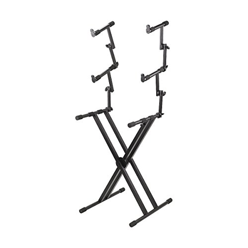 -. Feature : Double x-brace design.3 separately adjustable tiers.Locking height and width.Quick release lever.Fully-welded contact points.Supports medium to full-size keyboards.
