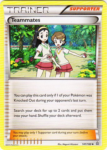 -. Binding : Toy -. Brand : Pokémon -. Edition : XY P.R.Imal Clash -. Feature : A single individual card from the Pokemon trading and collectible card game (TCG/CCG). / This is of Uncommon rarity. / From the XY P.R.Imal Clash set. -. IsAdultProduct : 0 -. ItemPartNumber : 141/160 -. Label : Pokemon USA, Inc. -. Manufacturer : Pokemon USA, Inc. -. MPN : LYSB00S5LNGZM-TOYS -. PackageQuantity : 1 -. PartNumber : LYSB00S5LNGZM-TOYS -. ProductGroup : Toy -. ProductTypeName : TOYS_AND_GAMES -. Publisher : Pokemon USA, Inc. -. Studio : Pokemon USA, Inc. -. Title : Pokemon - Teammates (141/160) - XY P.R.Imal Clash