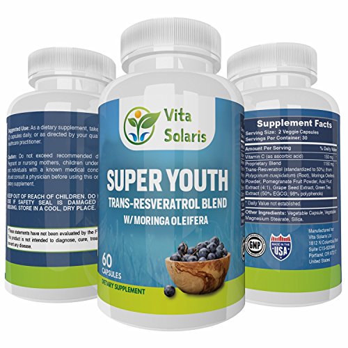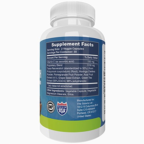 Trans Resveratrol Standardized to 50%, Moringa Oleifera Powder, Pomegranate Seed Extract Powder, Acai Fruit Extract, Grape Seed Extract, 4:1, Green Tea Extract (50% EGCG, 98% Polyphenols) and Vitamin C 150mg.