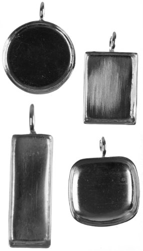 Our bonus resin pendant bezel pack is the perfect way to extend the Art Night Out Resin Pendant Party Kit experience to celebrate special moments. Get together with your friends and create something truly wonderful. Whether it is a birthday party, a bridal shower, or just a way to share some quality time with friends--make your next gathering one to remember. This bonus pack features high quality artisan made silver plated bezels that have the look & feel of sterling. You and your friends will be thrilled with your activity and your finished product. Contains 4 silver plated pendant bezel blanks (1-inch circle with 0.25-inch bail; 1 by 1-inch rounded square pendant with 0.25-inch bail; 0.75 by 1-inch rectangle with 0.25-inch bail; and 0.5 by 10.5-inch long rectangle with 0.44-inch bail) for use in jewelry making. These premium bezels feature sterling silver over brass giving it the weight and feel of solid sterling at less than half the cost. Great for professional jewelers. Depth ranges from 0.125 inch (rounded square and circle) to .25 inch (rectangle and long rectangle). Quality look can be used with resin or clay to create your own custom jewelry. Chain sold separately. Purchase additional bonus bezel kits (earring or pendant) to make up to 4 more pieces of jewelry per pack. Other required materials are the Ice Resin syringe (1 oz.) with mixing cups and sticks, a variety pack of collage papers, Claudine Helmut studio gloss medium & paintbrushes, Fido and scissors. These can also be purchased through Art Night Out. (Contents may vary due to availability. Substitutions will be of equal or higher value.)Feature
