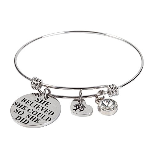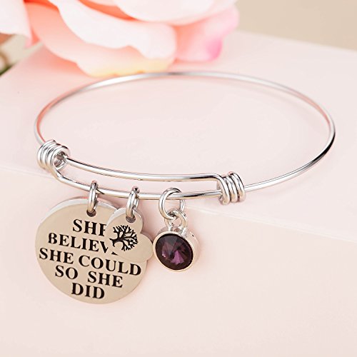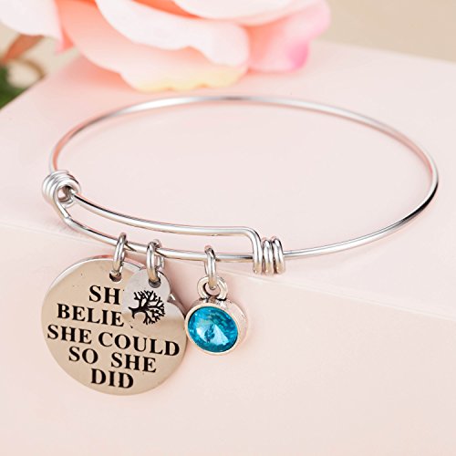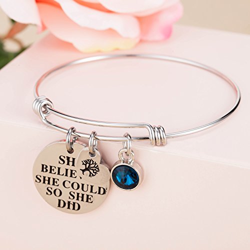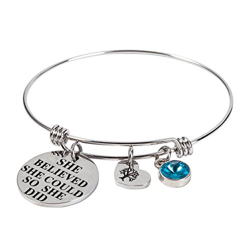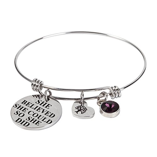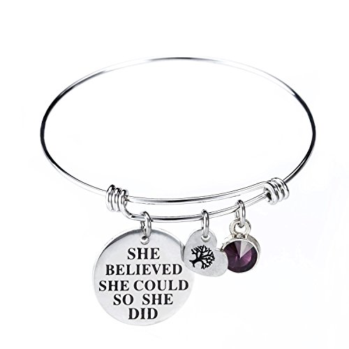 -. Feature : This beautiful birthstone inspirational expandable cuff bangle bracelet come with a birthstone charm and an engraved 'she believed she could so she did' letter round plate and a heart shape family tree of life charm. Unique gifts for special encouragement from sister, brother, father, mother daughter, grandma. / This birthstone bracelet matchs with all kinds of apparel and be suitable for any occasion, especially for birthday and anniversary day, there are 12 different color of crystal simulated birthstone bracelet, standing for 12 different months, choose the one of your birth month and enjoy a wonderful day. Perfect birthday gifts for her, girls, sister, wife, women, friendship. / This piece will come with a highly polished with a mirror-like finish on the double sided, and there is a layer of plastic film to protect it, avoid wear, keep luster. made with 316L stainless steel, Non plating, Non allergic, Non fade. / This bracelet can is expandable, you can easily adjust the bracelet to perfectly fit your wrist size! This will be suitable for more people, do not worry about the size problem. In the left column of our show pictures have a detailed description of how to adjust the bracelet size. / Package come with a velvet bag, High quality made and great words stamped. Eco-friendly perfect for birthday gifts, thanksgiving day gifts, christmas day gifts, new yew gifts, mother gifts, sweetheart, wife gifts.
