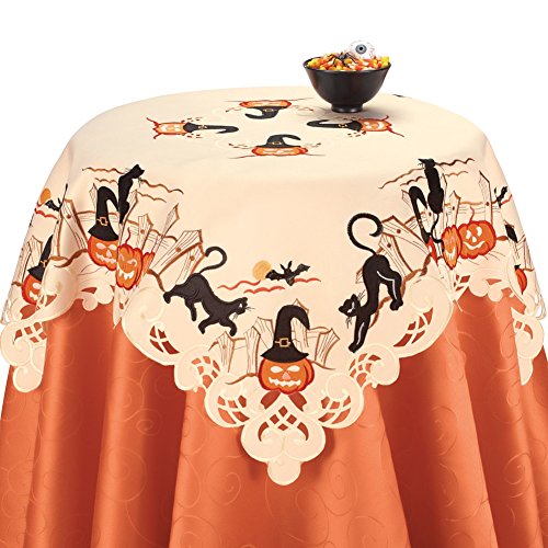 -. Feature : Black cats, jack-o-lanterns and other spooky Halloween icons decorate these fun table toppers / Colorful embroidery enhances the design against a cream background / Intricate cutouts and scalloped edges look great on their own / Available either as a Runner (67 3/4"L x 12 1/2"W) or a Square (33 1/2"Sq.) / Shop with confidence! For over 50 years, Collections Etc has been bringing unique, whimsical, inspirational, and home solution products to customers. All Collections Etc products come with a 60 day, easy return policy and 100% satisfaction guarantee