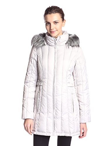 Zip-up puffer coat with vertical quilt stitching featuring faux-leather side tabs at waist and removable hood with faux-fur trim