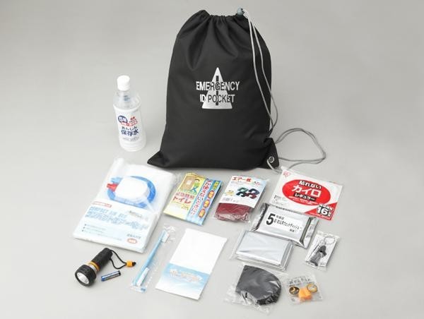 | 素材・材質 | 非常袋:ポリエステル コンパクトエアーベッド:リニア低密度ポリエチレン 防寒シート:アルミ蒸着ポリエステル 耳せん:ポリウレタン アイマスク:ポリエステル、ポリウレタン エアーマクラ:ポリエステル、PVC マスク:不織布 |