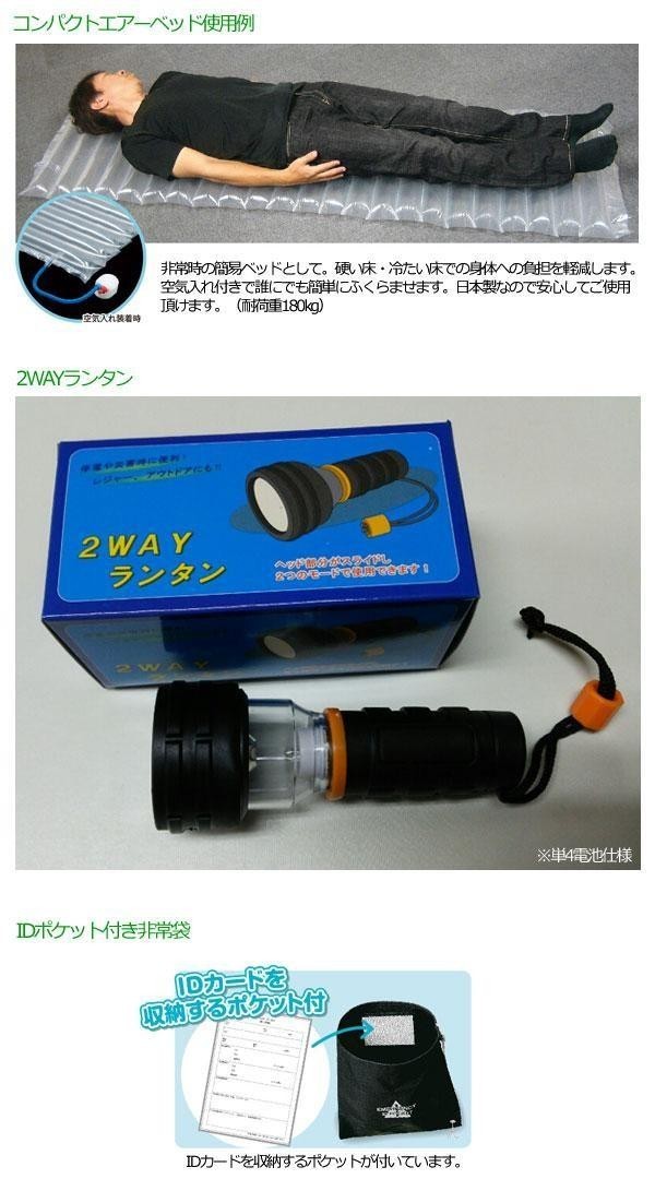 | セット内容 | IDポケット付非常袋(340×440mm)、コンパクトエアーベッド(1950×550×60mm:空気吸入時)、2WAYランタン、ランタン用マンガン単4電池×1本、防寒シート(210×130cm)、保存水(500ml)(賞味期限:5年)、カイロ、ハブラシセット、緊急簡易トイレ、安眠セット(耳せん・アイマスク)、防災用ウェットティッシュ(20枚)、エアーマクラ、ホイッスル、マスク(17.5×9.5cm) |