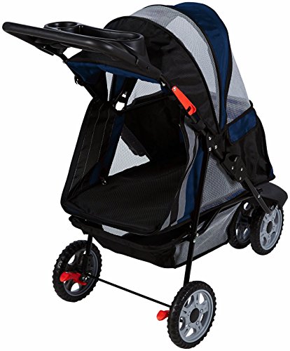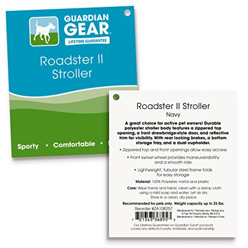 Studio : Guardian Gear Publisher : Guardian Gear Binding : Misc. Product Description Our Guardian Gear Roadster II Strollers let pet owners stroll with their pets in safe and sporty style. Features include front dual swivel wheels for easy maneuvering, zippered top and rear openings and mesh panels for ventilation and privacy. Lightweight, tubular steel frame folds for easy storage. Assembles easily without tools. Holds pets up to 30 lbs. Guardian Gear Roadster II Strollers also include a cup holder/snack tray, bottom storage compartment, paw print design accents, reflective side stripes and rear locking wheels. Available in Navy and Red styles. Material: Polyester Measures: 39"L x 19"W x 37 1/2"H fully opened Measures: 25"L x 14"W x 21"H inside pet compartment Depth of compartment with hood open is 8" Capacity: Holds pets up to 30 lbs. 0