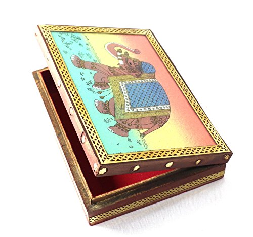 -. Feature : Richly crafted. Can be used to store earrings, watches, rings, precious and fashion jewelry. / Thoughtfully decorated with rajasthani art. Hinged lid, with interior base and roof covered in velvet cloth. Sturdy, solid wood / Best for unique gifting purpose / Looks highly elegant and vintage classic in itself. / L*W*H*=7.5"*5"*1.5"