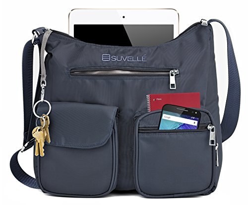 Practical, stylish and organize to the max!! The Suvelle Lightweight Carryall Travel RFID Blocking Protection Crossbody Bag offers multiple options for storing your essentials and to carry everything you need for a day out, while the RFID blocking card slots shields your identity from readers or scanners now you can go about your days worry-free and always look stylish! Suvelle Lightweight Carryall Travel RFID Blocking Protection Crossbody Bag Multi Pocket Shoulder Handbag is styled in practical, durable water resistant and stain resistant nylon material and designed with a variety of convenient pockets, 4 front exterior easy-access pockets ideal for cell phone, wallet, sunglasses and small accessories. The interior is fully lined in easy-to-see silver lining that helps find items fast, the main zippered interior offers: plenty of storage to fit an ipad, tablet and your daily essentials, a back wall zippered mesh pocket to keep important items at your fingertips, 5 RFID blocking card slots will protect from electronic pick pocketing, 2 pen loops, an open multi purpose pocket and a fob key ring to keep your keys handy. The Suvelle Lightweight Carryall Travel RFID Blocking Protection Crossbody Bag Multi Pocket Shoulder Handbag is furnished with an adjustable crossbody strap for effortless around-town carrying convenience!!!Feature