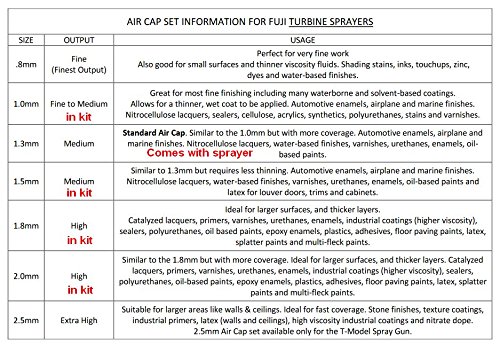 - 1.5mm (Similar to the 1.3mm set that comes with the HVLP sprayer) but requires less thinning. Automotive enamels, airplane and marine finishes. Nitrocellulose lacquers, water-based finishes, varnishes, urethanes, enamels, oil-based paints and latex for louver doors, trims and cabinets.