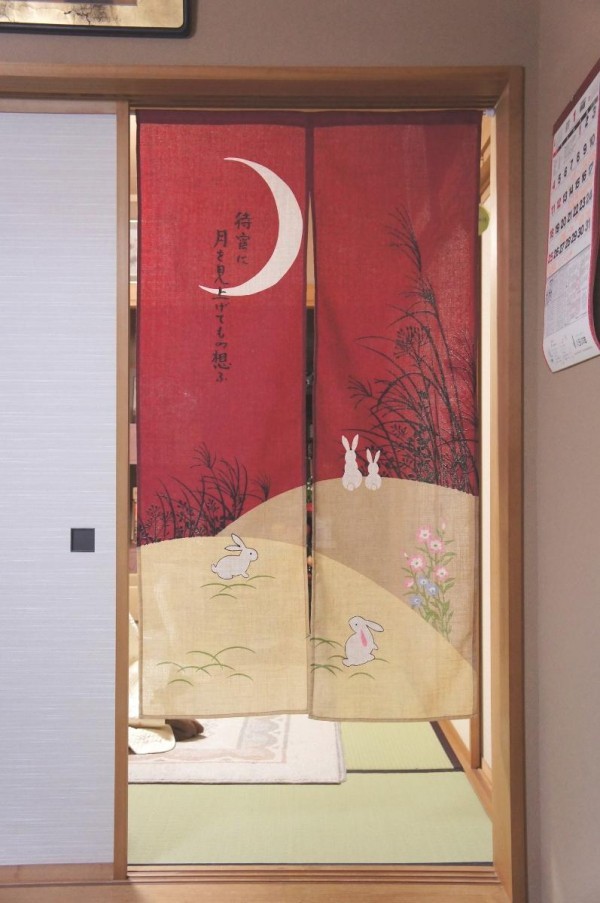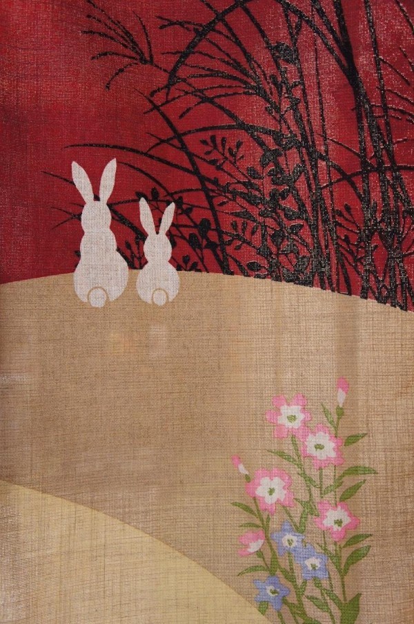 秋の空に浮かぶ月は綺麗だけれど、ちょっぴり寂しい…。静かな丘で耳を澄ませば、風に揺れるススキのざわめきだけが聞こえるようです。可愛いうさぎが物語の一場面のような雰囲気をかもし出すのれんです。麻のような風合いに仕上げました。 |