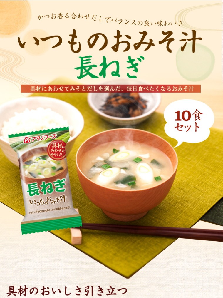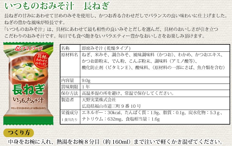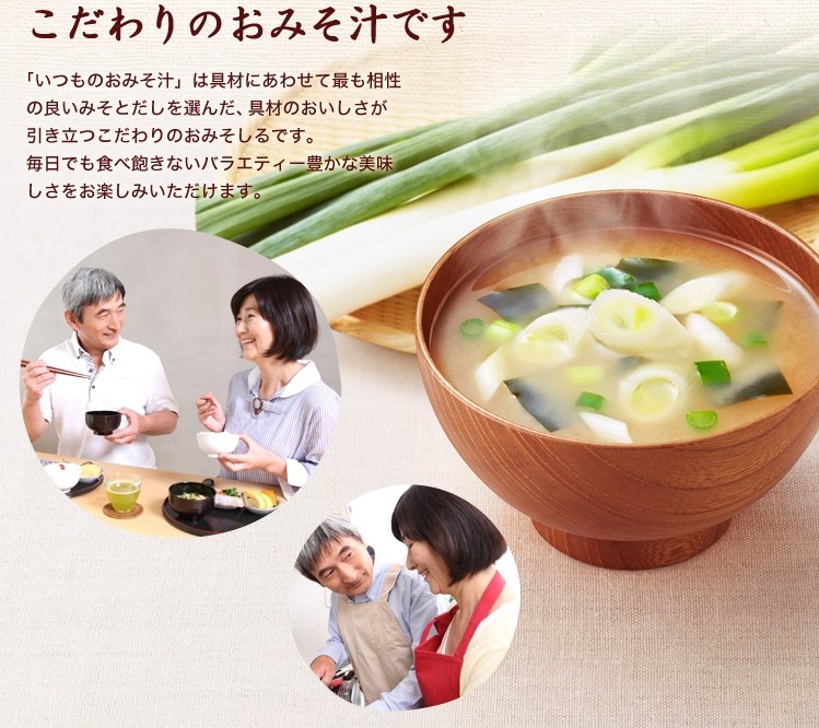 長ねぎの甘みにあわせて甘めのみそを使用し、かつお香る合わせだしでバランスの良い味わいに仕上げました。ねぎの豊かな風味が特長です。「いつものおみそ汁」は、具材にあわせて最も相性の良いみそとだしを選んだ、具材のおいしさが引き立つこだわりのおみそ汁です。毎日でも食べ飽きないバラエティー豊かなおいしさをお楽しみ頂けます。中身をお椀に入れ、熱湯をお椀8分目(約160ml)まで注いで軽くかき混ぜてください。
