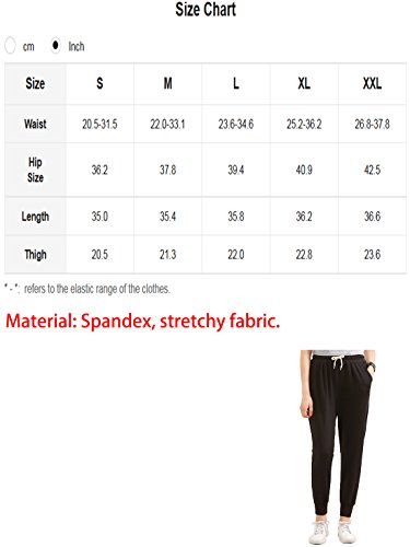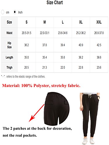 -. Feature : Material: 100% Polyster, stretchy fabric. / Elastic waistband, adjustable drawstring, mid waist, front pockets, ribbed cuffs. / Drawcord on elastic waist for a personalized fit. The 2 patches at the back for decoration, not the real pockets. / Perfect for jogging, running, yoga and others fitness activities. Great to match with t-shirt, crop top, tank top, active tops. / Refer our size chart(Not Amazon)/ S-Waist:20.5-31.5", Hip: 36.2", Length: 35.0", Thigh: 20.5"./ M-Waist:22.0-33.1", Hip: 37.8", Length: 35.4", Thigh: 21.3"./ L-Waist:23.6-34.6", Hip: 39.4", Length: 35.8", Thigh: 22.0"./ XL-Waist:25.2-36.2", Hip: 40.9", Length: 36.2", Thigh: 22.8"./ XXL-Waist:26.8-37.8", Hip: 42.5", Length: 36.6", Thigh: 23.6"./