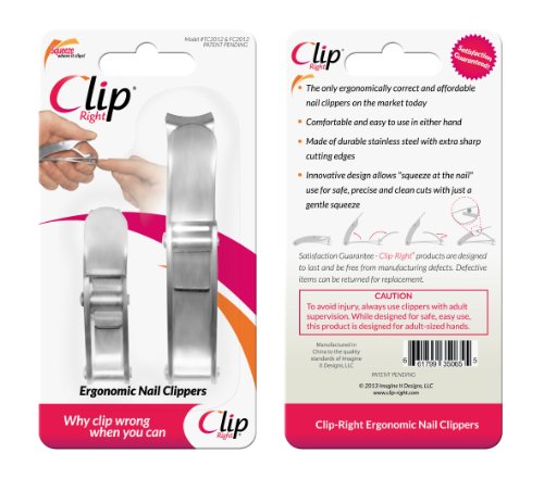-. Binding : Misc. -. Brand : Clip-Right -. EAN : 0661799350662 -. Feature : Innovative "squeeze at the nail" design for easy use and accuracy / The only ergonomically corect and affordable nail clipper on the market today / 100% stainless steel construction for durability and extra sharp cutting edges / Comfortable and easy to use in either hand / Safer and easier to use than traditional nail clippers with their 100+ years old designs -. IsAdultProduct : 0 -. Label : Imagine It Designs, LLC -. Manufacturer : Imagine It Designs, LLC -. Model : TC2012 & FC2012 -. MPN : TC2012 & FC2012 -. NumberOfItems : 96 -. PackageQuantity : 2 -. PartNumber : TC2012 & FC2012 -. ProductGroup : Beauty -. ProductTypeName : BEAUTY -. Publisher : Imagine It Designs, LLC -. Size : Large and small -. Studio : Imagine It Designs, LLC -. Title : Clip-Right® Ergonomic Nail Set -. UPC : 661799350662