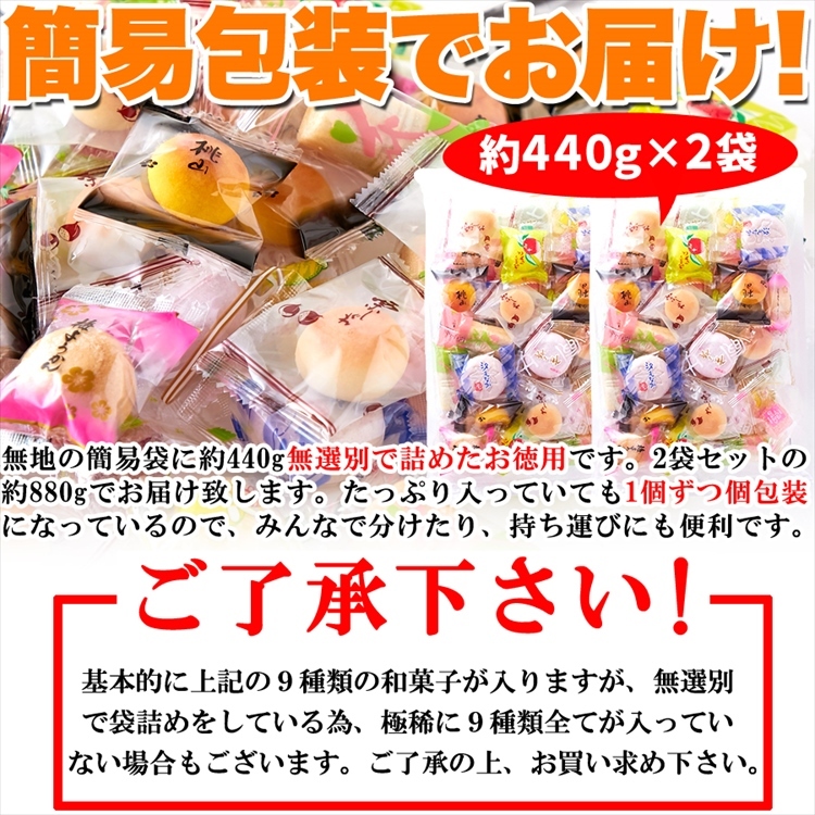 無地の簡易袋に約440g無選別で詰めたお徳用です。2袋セット約880gでお届け致します。たっぷり入っていても1個ずつ個包装になっているので、みんなで分けたり、持ち運びにも便利です。