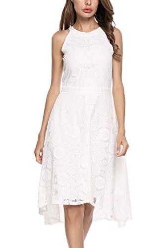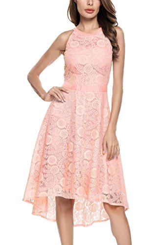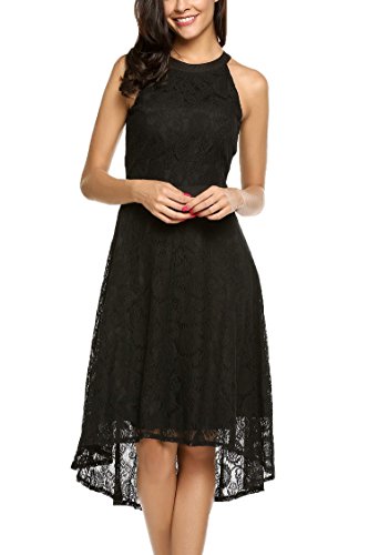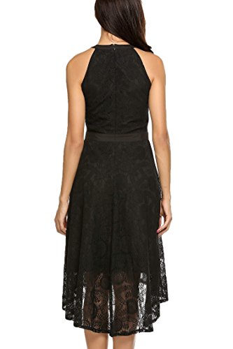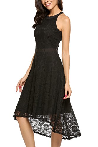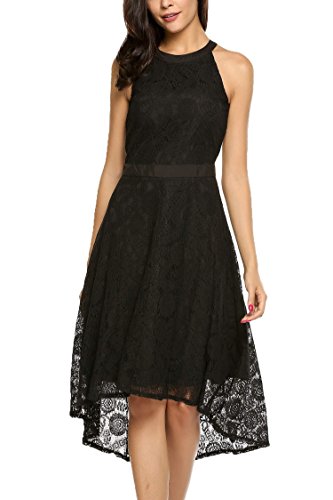 Features:Halter Neckline,Sleeveless,Patchwork Waist,High-low Hemline,Flared Skirts,Hollow Floral Lace Decor,and Back Conceal Zipper for Easy on/off.