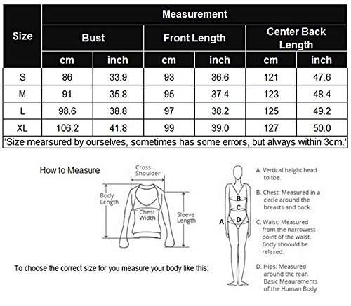 Measurement: 1.Hint for choosing proper size, use similar clothing to compare with the size. 2.Choose larger sizes if your size are same as the flat measurement Size Chart. Size Chart(inches) S:----Chest 33.9"------Front Length 36.6"------Center Back Length 47.6"