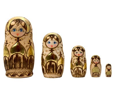 -. Title : Woodburned Church Russian Nesting Doll 5pc./4"