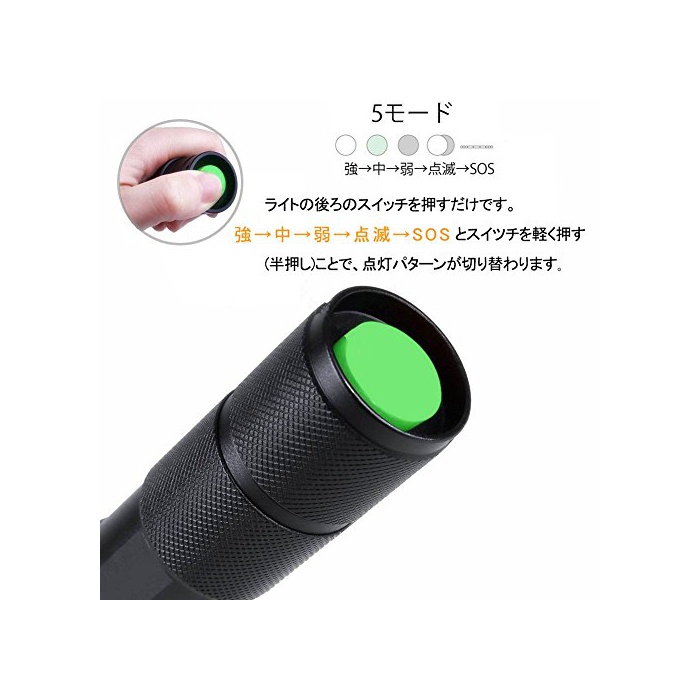 【5개 점등 모드】라이트의 뒤의 스위치를 누르는 뿐입니다.강하다→중→약→점멸→SOS 와《스이츠치》를 가볍게 누른다(반누르기)것으로,점등 패턴이 완전히 바뀝니다SOS신호 패턴점 기능 첨부 와!배면 에 있는《스이츠치》을 강하게 누르는 것에,ON/OFF의 교환.