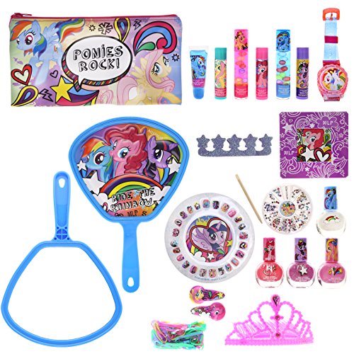 Studio : TownleyGirl Publisher : TownleyGirl Binding : Health and Beauty Product Description Kids will have an amazing time playing pretend with this mega cosmetic set. Easy and fun to apply polishes and super sparkly glosses are just the beginning; this set also includes: nail gems, hair ties, hair clips, crown hair comb, toe separators, nail file, picture frame, wooden stick, mirror and zippered bag. Everything in the set is adorned with everyone's favorite My Little Pony characters, which your little princess is sure to love! See bullets and images for more information. 0