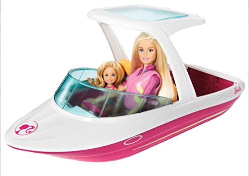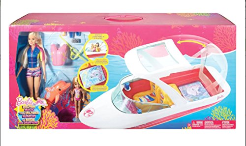 -. Feature : WHAT'S INCLUDED: Boat, Barbie doll with outfit / Chelsea doll with outfit, Life vest and snorkel mask / Two drinks cups, Bottle of sunscreen / Toy Camera, Dolphin squirt toy / Measures: 12.75"H x 28"W x 7"D