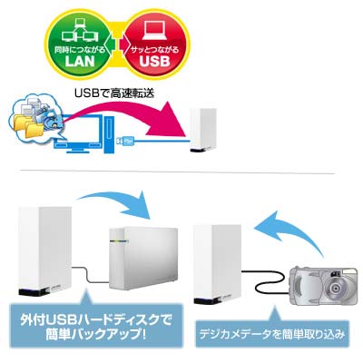 ???LAN DISKに保存しているファイル全てを外付USBハードディスクへバックアップできる。また、USBポートに接続したデジカメのデータを直接保存できる「クイックコピー」機能も搭載。