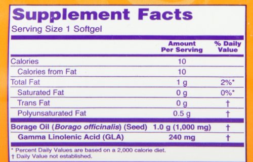 -. Binding : Health and Beauty -. Brand : Now Foods -. Department : Health and Beauty>Health and Wellness -. EAN : 0733739017222 -. Feature : Take 1 softgel 1-2 times daily, preferably with meals / Rich in omega-6 fatty acids / 240mg of GLA -. IsAdultProduct : 0 -. IsAutographed : 0 -. IsMemorabilia : 0 -. Label : Now Foods -. LegalDisclaimer : * These statements have not been evaluated by the Food and Drug Administration. This product is not intended to diagnose, treat, cure or prevent any disease. **Always refer to the manufacturer's label on the product for description, recommended dose and precautions. -. Manufacturer : Now Foods -. Model : NOW1015/303/1501 -. MPN : NOW1015/303/1501 -. NumberOfItems : 1 -. PackageQuantity : 1 -. PartNumber : NOW1015/303/1501 -. ProductGroup : Health and Beauty -. ProductTypeName : HEALTH_PERSONAL_CARE -. Publisher : Now Foods -. ReleaseDate : 2008-02-08 -. Size : 120 -. Studio : Now Foods -. Title : BORAGE OIL 1000 mg 120 SGELS -. UPC : 733739017222