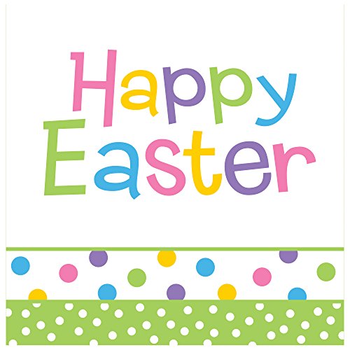 - Reads Happy Easter in colorful letters on white background; accented with colorful polka dots on white and white polka dots on lime green