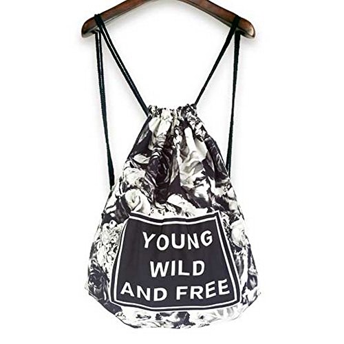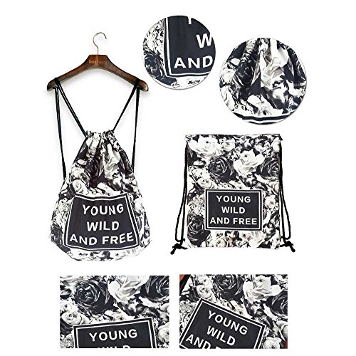 -. Title : Zokey Canvas Drawstring Gym Sackpack Backpack Bag Black Flower Young Wild And Free
