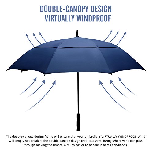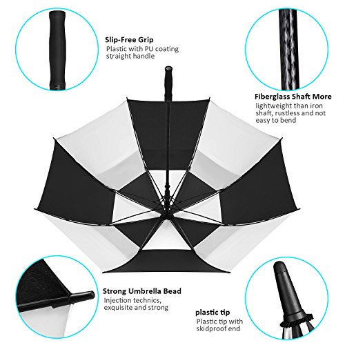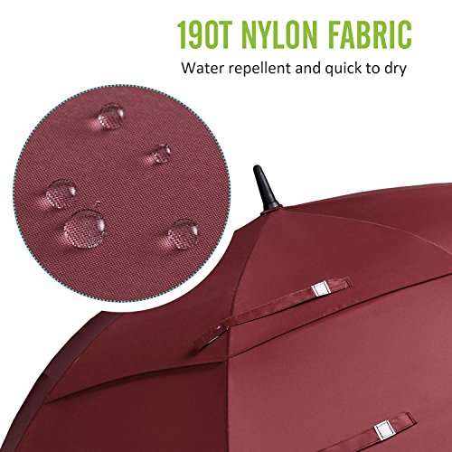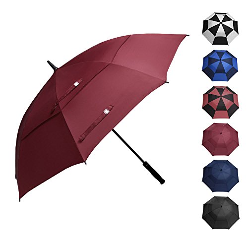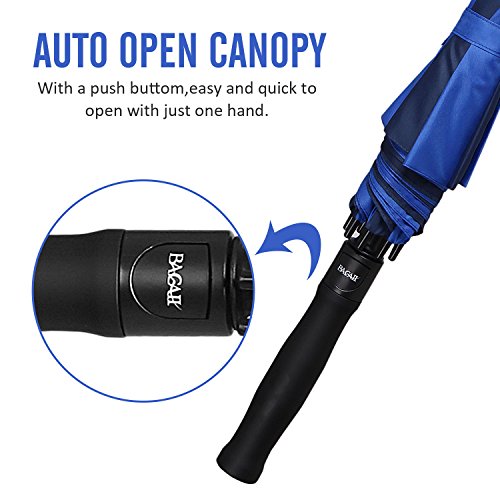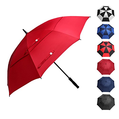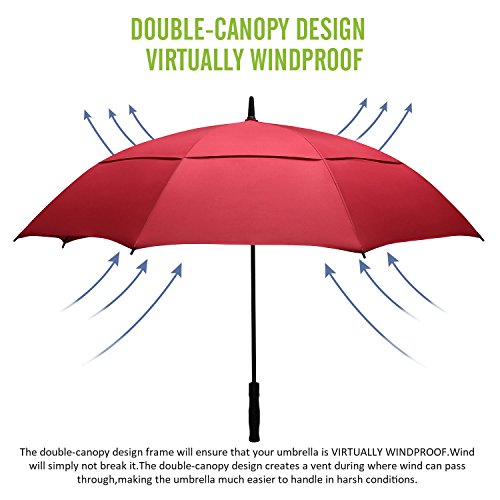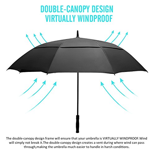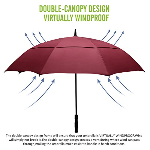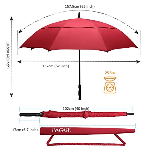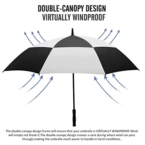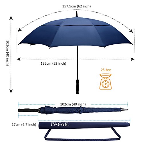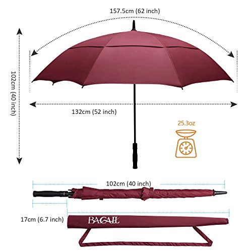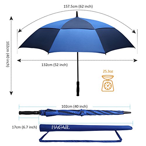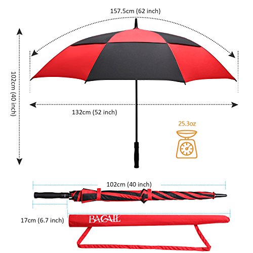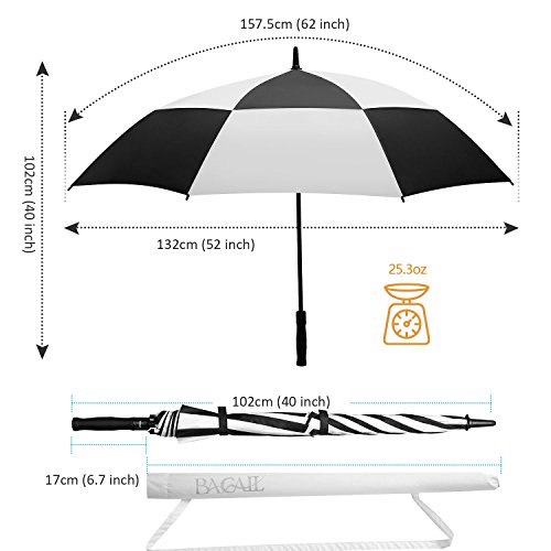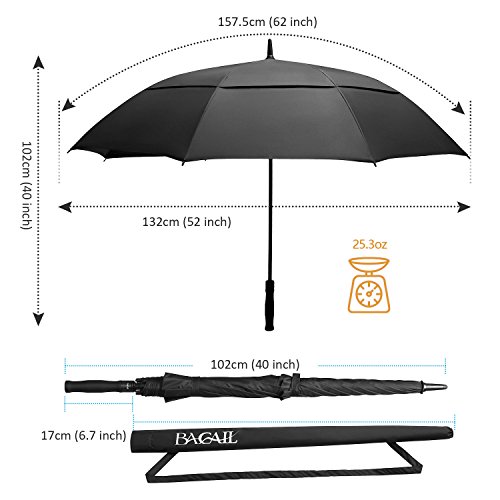 INCREDIBLE GOLF UMBRELLA BAGAIL 62-Inch Golf Umbrella is used by many golfing professionals due to its durability and effectiveness. It is quite large. The 62-inch diameter canopy provides coverage for two people. It also uses a double canopy design. This adds strength and flexibility. The solid framework underneath flexes with the wind so that the umbrella keeps its shape. In fact, it's been tested to withstand over 55 MPH winds. The shaft is made from lightweight fiberglass material and is finished off with a rubber handle. It comes in a few muted colors and has a lifetime warranty, ensuring you'll never be without it