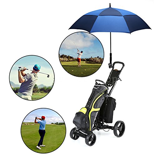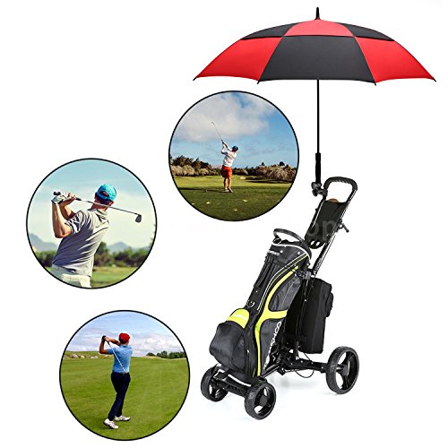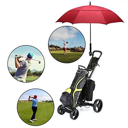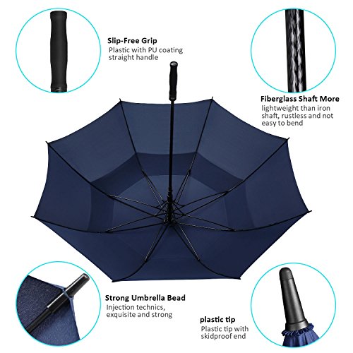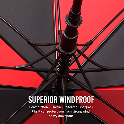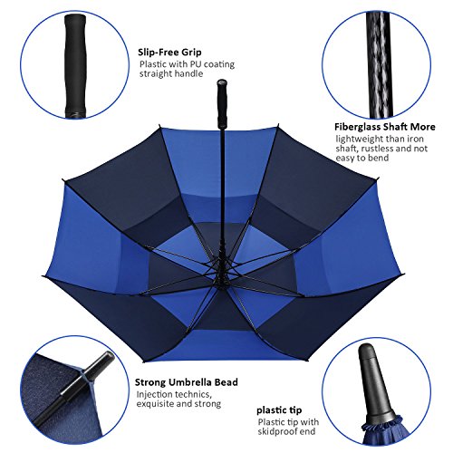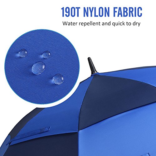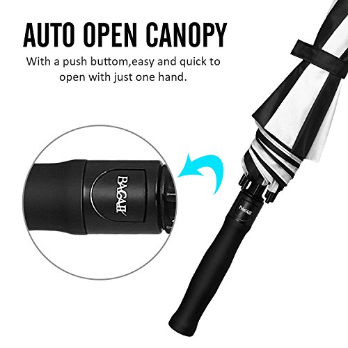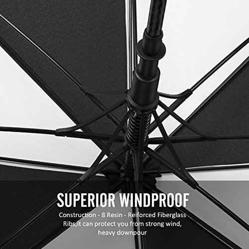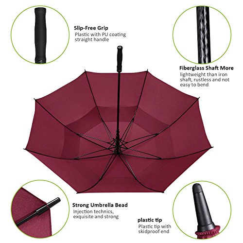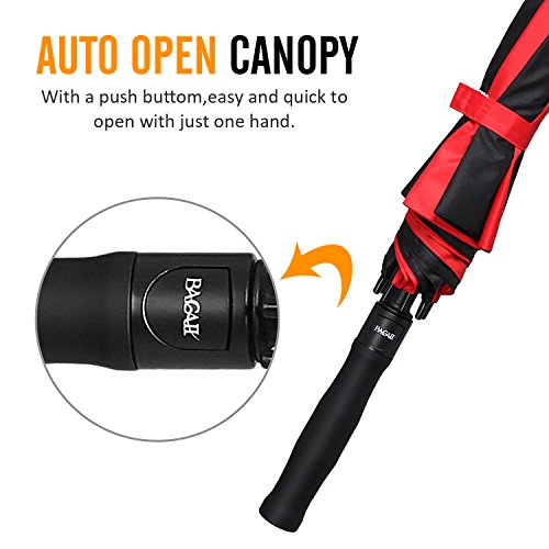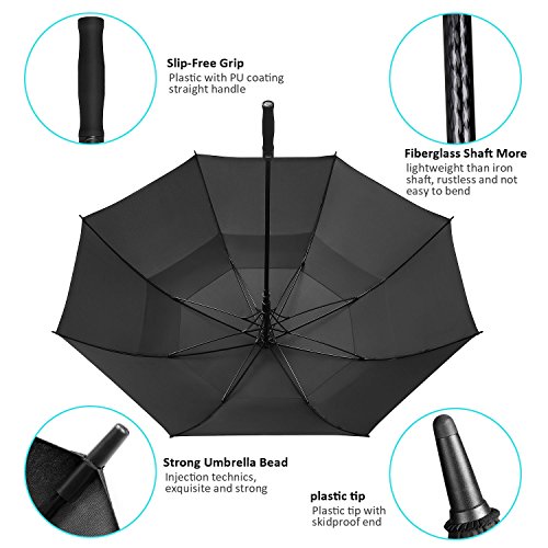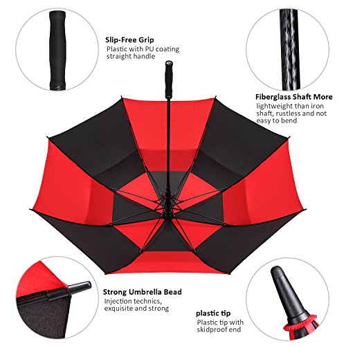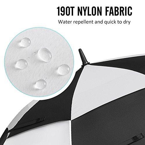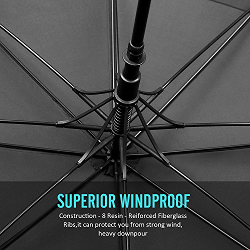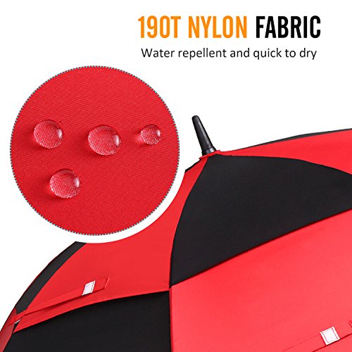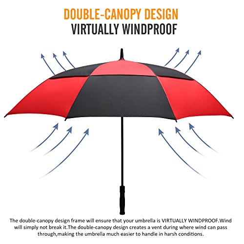 INCREDIBLE GOLF UMBRELLA BAGAIL 62-Inch Golf Umbrella is used by many golfing professionals due to its durability and effectiveness. It is quite large. The 62-inch diameter canopy provides coverage for two people. It also uses a double canopy design. This adds strength and flexibility. The solid framework underneath flexes with the wind so that the umbrella keeps its shape. In fact, it's been tested to withstand over 55 MPH winds. The shaft is made from lightweight fiberglass material and is finished off with a rubber handle. It comes in a few muted colors and has a lifetime warranty, ensuring you'll never be without it