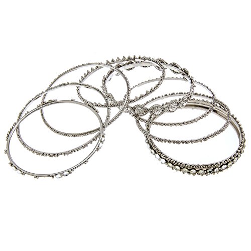 Here is a lovely 8 piece antique style silvertone clear crystal bracelet set. They can be worn all together or individually depending on your preference. Bracelets all together measure 1.75" wide and 2 5/8" in diameter. There is no clasp.Feature