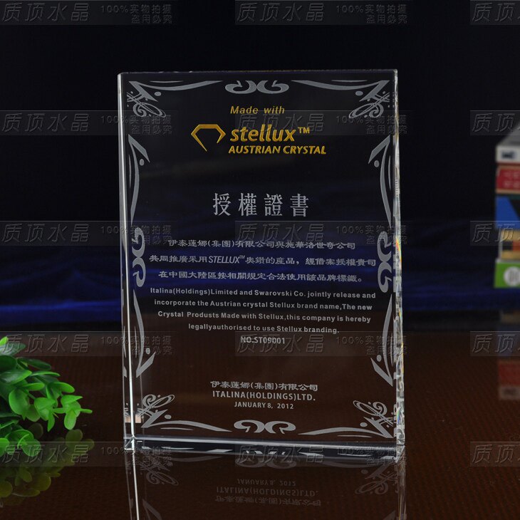 工 艺 喷刻工艺,文字图案是刻在水晶表面,内凹的.不是印刷的。 20件以上同版本主体可做激光内刻工艺,费用高3-12元