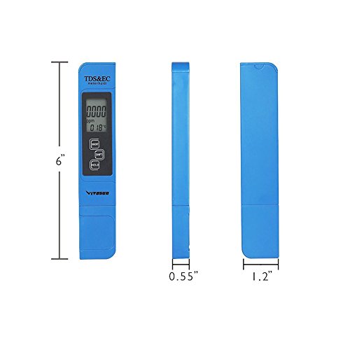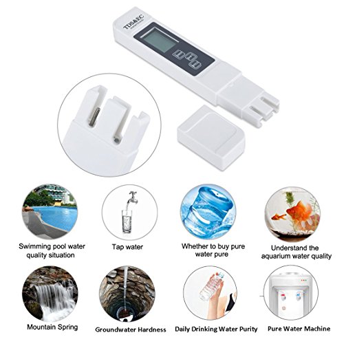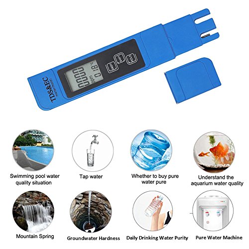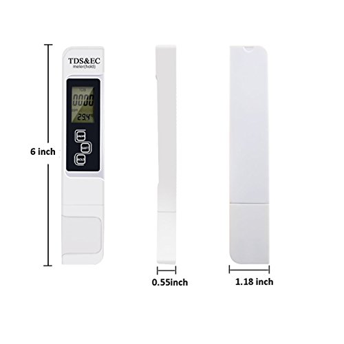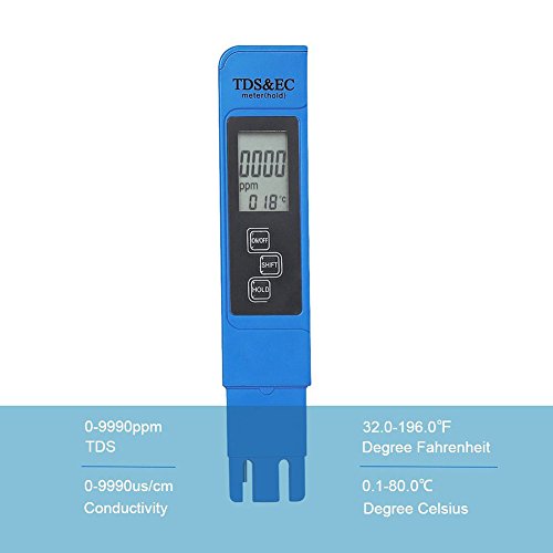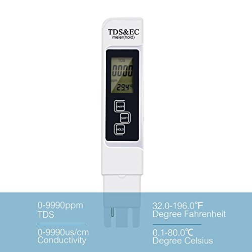 -. Feature : 3-In-1 Digital TDS meter provides accurate readings for TDS (Total Dissolved Solids) EC (Electrical Conductivity) and temperature / HOLD automatic locking, SHIFT automatic conversion, built-in automatic temperature compensation, 3 functions in one. / Measurement Range:0-9990ppm, 0-9990µs/cm; Accuracy: ± 2%, 0.1- 80.0°C, 32.0-176.0°F.; Factory calibrated; Automatic Temperature Compensation (ATC) / Automatic shutdown function: 5 minutes after the switch off the table in order to save the battery, the use of a long time, 4 digit display, saving measurement convenient reading and recording. / Ideal for all water quality testing, water purification applications, wastewater regulation, aquaculture, hydroponics, colloidal silver, labs & scientific testing, pools & spas, ecology testing, boilers & cooling towers, water treatment and more.