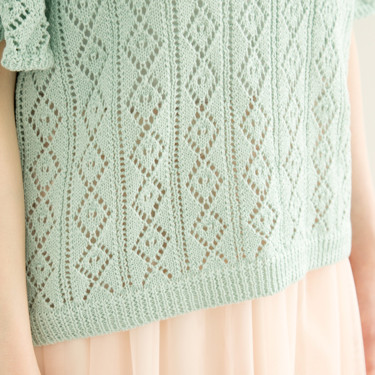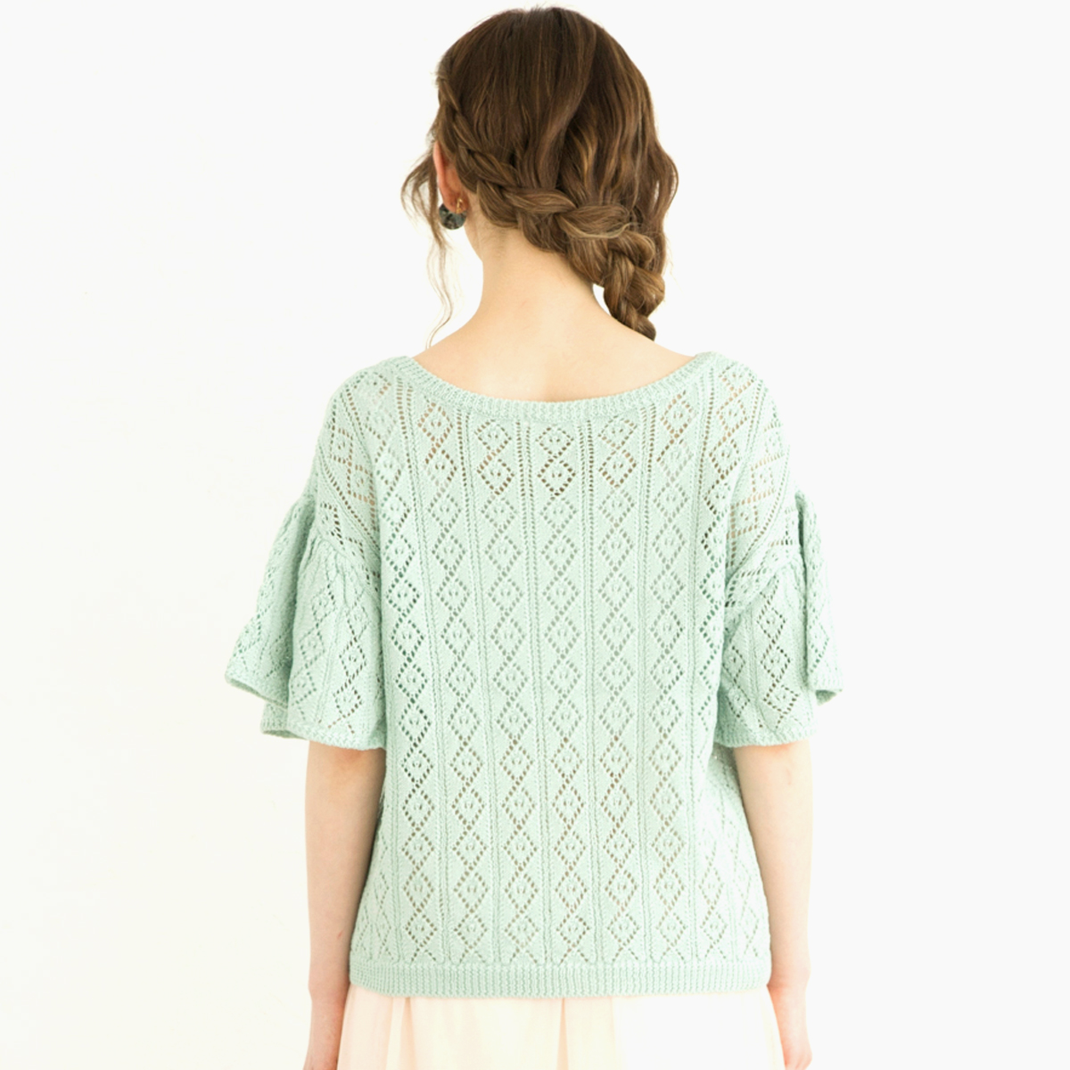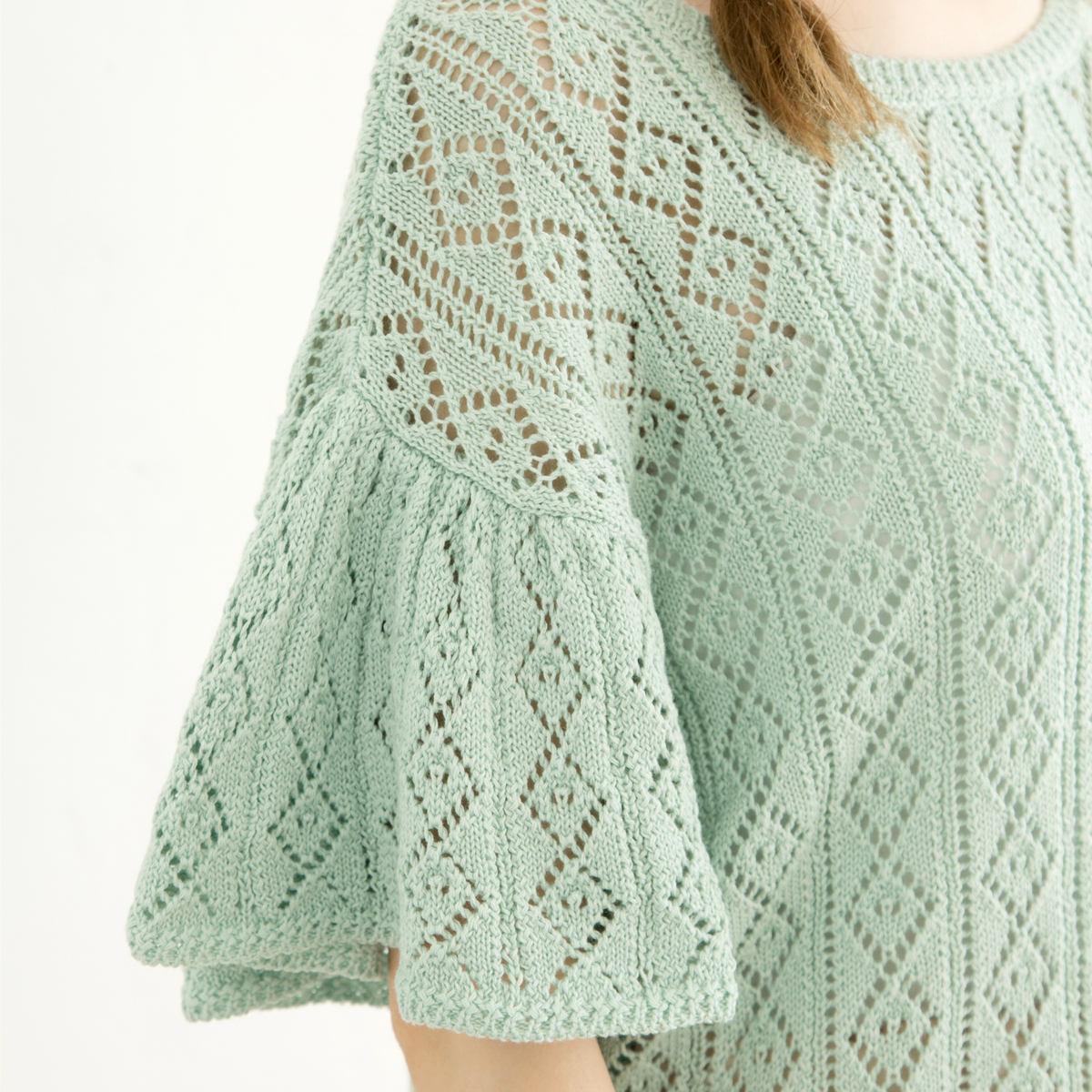 透かし柄編み素材を使用し、ニットでもカジュアルでフェミニンな印象に仕上げてくれます。ゆったりシルエットで柔らかい着心地が◎。流行のひらひらと動きのあるフレア袖が、女性らしく春らしさを演出してくれます。春先から真夏まで、長く活躍してくれる1枚です。