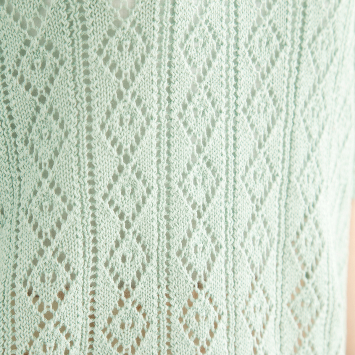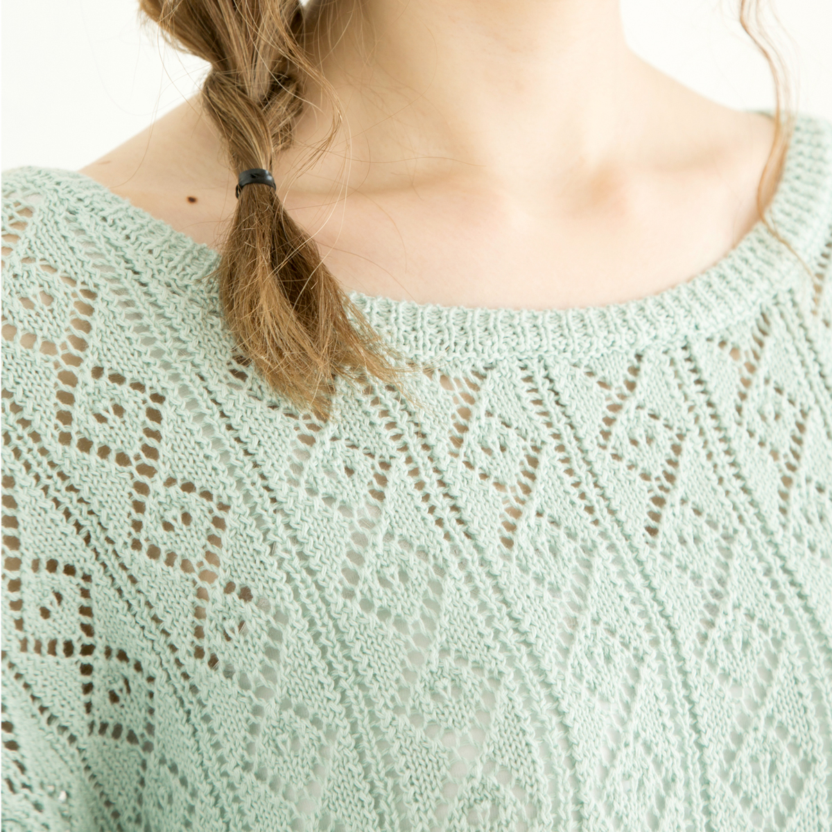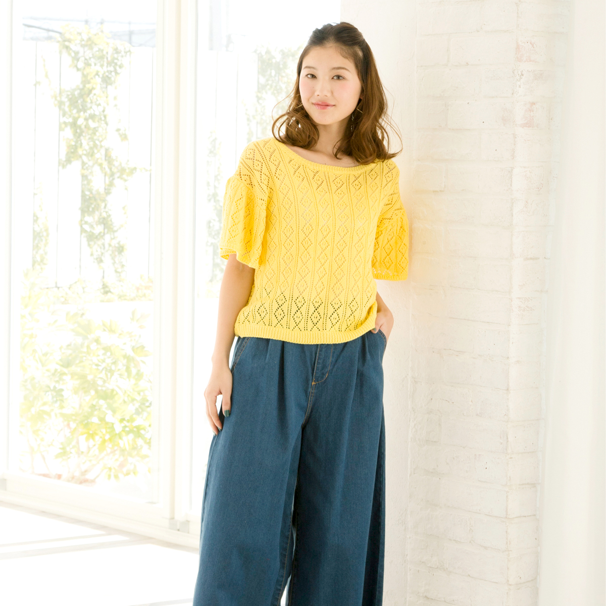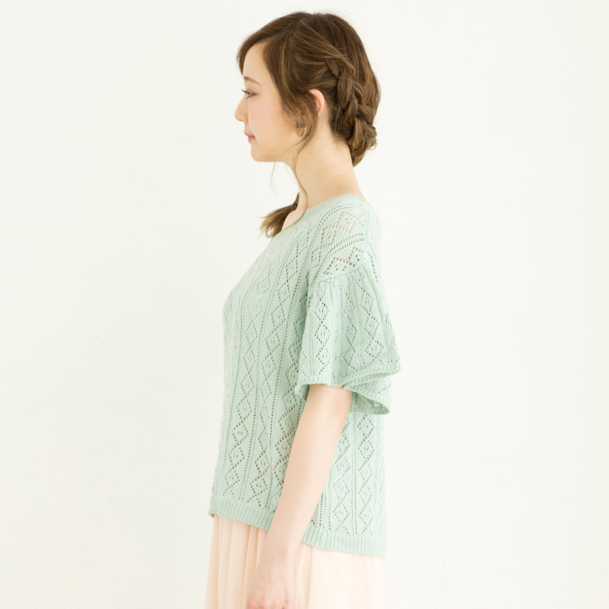 透かし柄編み素材を使用し、ニットでもカジュアルでフェミニンな印象に仕上げてくれます。ゆったりシルエットで柔らかい着心地が◎。流行のひらひらと動きのあるフレア袖が、女性らしく春らしさを演出してくれます。春先から真夏まで、長く活躍してくれる1枚です。
