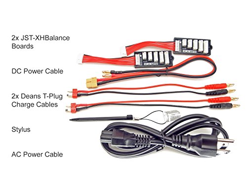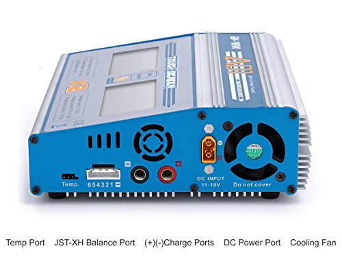 AC Input: AC 100-120V OR 220-240V DC Input: DC 11.0-18.0V Charge current: 0.1-10.0A Discharge current: 0.1-5.0A Charge power: 100W ea Discharge power: 12W ea Balance current: 350mA Balance tolerance: ±0.01V Ni cells: 1-15cells Lithium: LiPo LiIon LiFe LiHv Lithium cells: 1-6Series Pb: 2V-24V mAh Capacity: 100-50,000mAh Digital Power: 3V-24V Weight: 1250g Dimensions: 204x170x60mm 0