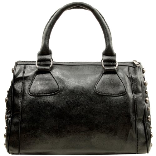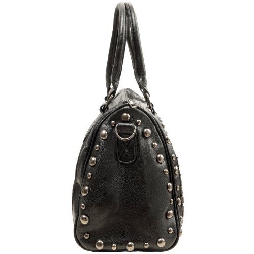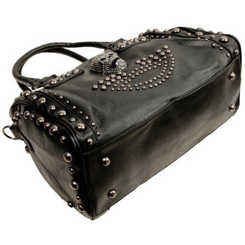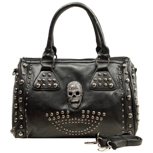 - Feature : Doctor-style handbag embellished with edgy metal studs and a 3D skull head. / 2 top handles and a detachable shoulder strap give multiple carrying options. / The roomy, lined interior includes 1 zippered pouch and 2 pockets. Made of manmade material. / ** HOWEA MG Collection® product by MyGift®. Products sold by other sellers may vary. ** / Approximate Dimensions: Exterior - 9.5" H X 14" W X 5" D; Interior - 9" H X 13.5" W X 5" D; Handle - 6" drop; Shoulder Strap - 24" drop.