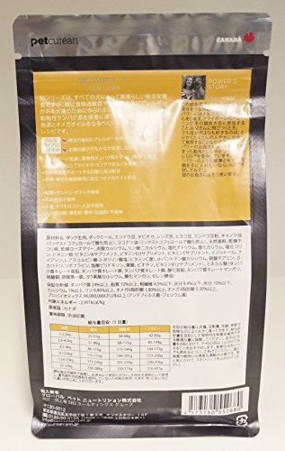 原材料:ダック生肉、ダックミール、エンドウ豆、タピオカ、レンズ豆、ヒヨコ豆、エンドウ豆粉、キャノラ油(ミックストコフェロールで酸化防止)、ココナツ油(ミックストコフェロールで酸化防止)、天然香料、乾燥チコリ根、乾燥ローズマリー、炭酸カルシウム、リン酸二カルシウム、塩化ナトリウム、塩化カリウム、塩化コリン、ビタミン類(ビタミンAサプリメント、ビタミンD3サプリメント、ビタミンEサプリメント、イノシトール、ナイアシン、L-アスコルビン酸-2-ポリリン酸塩(ビタミンC源)、d-パントテン酸カルシウム、硝酸チアミン、β-カロテン、リボフラビン、塩酸ピリドキシン、葉酸、ビオチン、ビタミンB12サプリメント)、ミネラル類(タンパク質キレート亜鉛、タンパク質キレート鉄、タンパク質キレート銅、酸化亜鉛、タンパク質キレートマンガン、硫酸銅、硫酸第一鉄、ヨウ素酸カルシウム、酸化マンガン、セレン酵母)