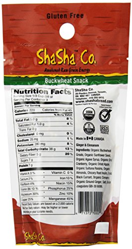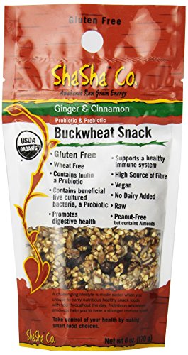 -. Binding : Grocery -. Brand : ShaSha Co. -. EAN : 0671372700029 -. Feature : They are an organic gluten free high energy protein snack wheat-free, dairy-free, raw and vegan they have no preservatives, additives they are a high source of protein and fiber; They are probiotic and prebiotic -. Label : ShaSha -. Manufacturer : ShaSha -. NumberOfItems : 1 -. PackageQuantity : 1 -. ProductGroup : Grocery -. ProductTypeName : GROCERY -. PublicationDate : 2013-07-14 -. Publisher : ShaSha -. ReleaseDate : 2013-07-14 -. Size : 6 Ounce -. Studio : ShaSha -. Title : ShaSha Organic Ginger/Cinnamon Buckwheat Snacks, 6oz (170g) -. UPC : 671372700029