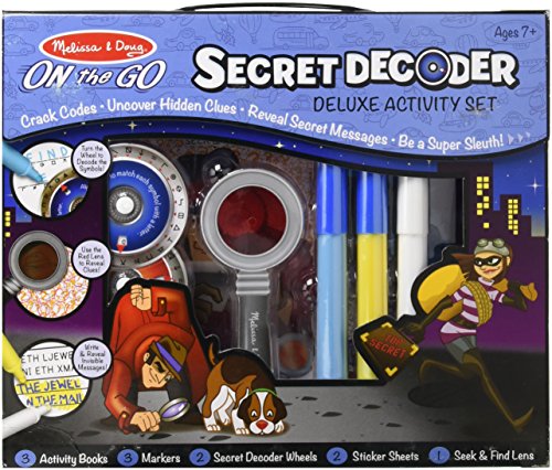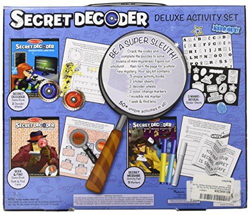 Add some mystery to travel days and amp up the thrill in your activity-book library with this cool spy set! The deluxe kit includes three activity books, each with a different spy technology: Use the decoder ring to find secret messages, reveal hidden clues with the spy glass, and solve all sorts of mysteries with the help of a trusty secret-message pen. Packaged in a take-along pack, the collection lets kids take the fun along on their next mission . . . and makes an ideal gift!Feature