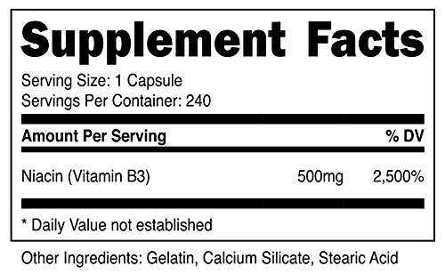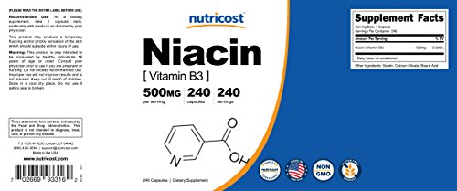 Each bottle contains 240 capsules of high quality 500mg of Niacin at an unbeatable price. Nutricost strives to provide the best supplements at the best prices. Please be aware that taking high dosages of Vitamin B3 (Niacin), especially when your body is not used to it, can lead to what is often referred to as the Niacin flush.Feature