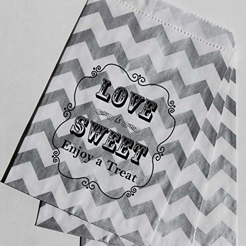 Bakers Bling Wedding Party Favor Bags with Stickers, Silver and White Chevron Stripe Love is Sweet Enjoy a Treat Candy Bags, 5.5 x 7.5, Set of 48 Bags and 48 Stickers