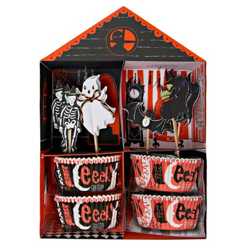 - The kit also has a choice of two styles of cupcake liners each patterned with scary slogans and characters. The kit comes packaged in a haunted house style presentation box.