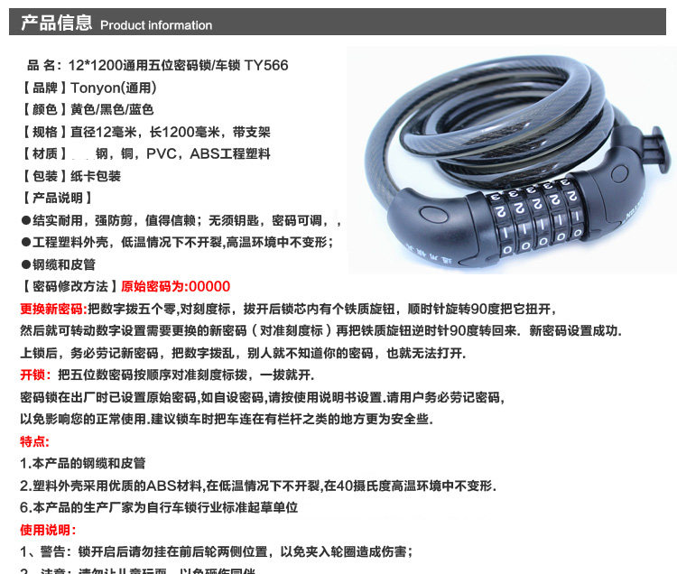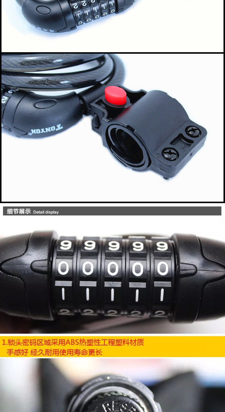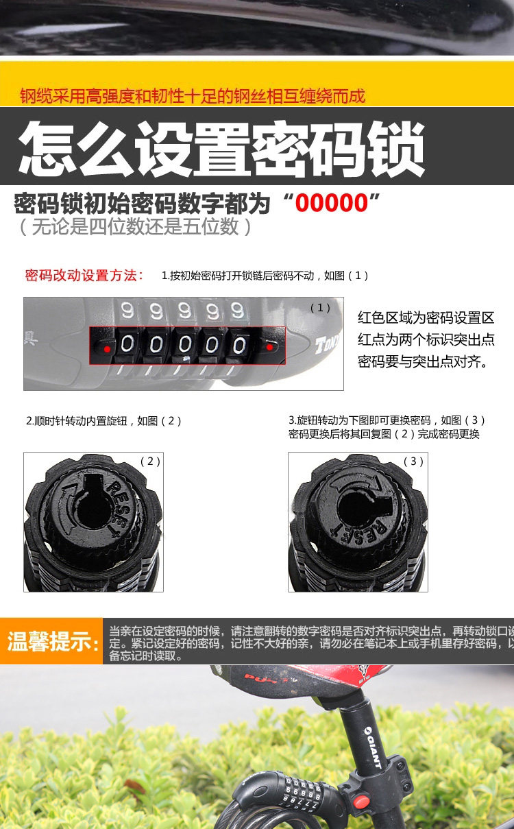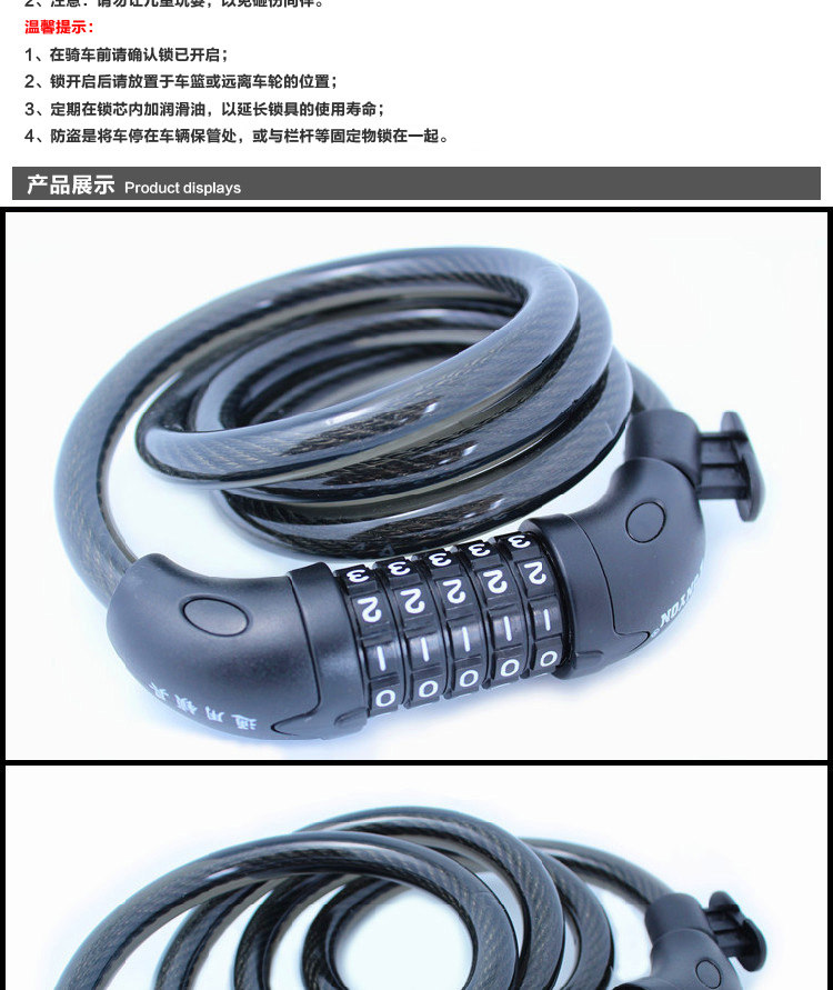 开锁:把五位数密码按顺序对准刻度标拨,一拔就开.密码锁在出厂时已设置原始密码,如自设密码,请按使用说明书设置.请用户务必劳记密码,以免影响您的正常使用.建议锁车时把车连在有栏杆之类的地方更为安全些.
