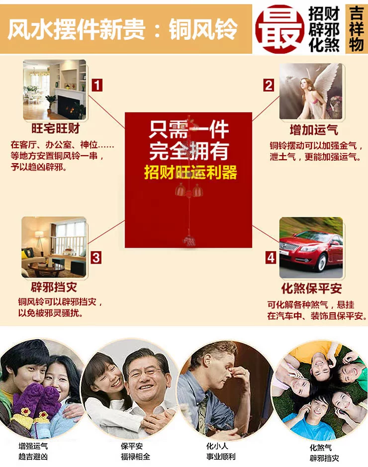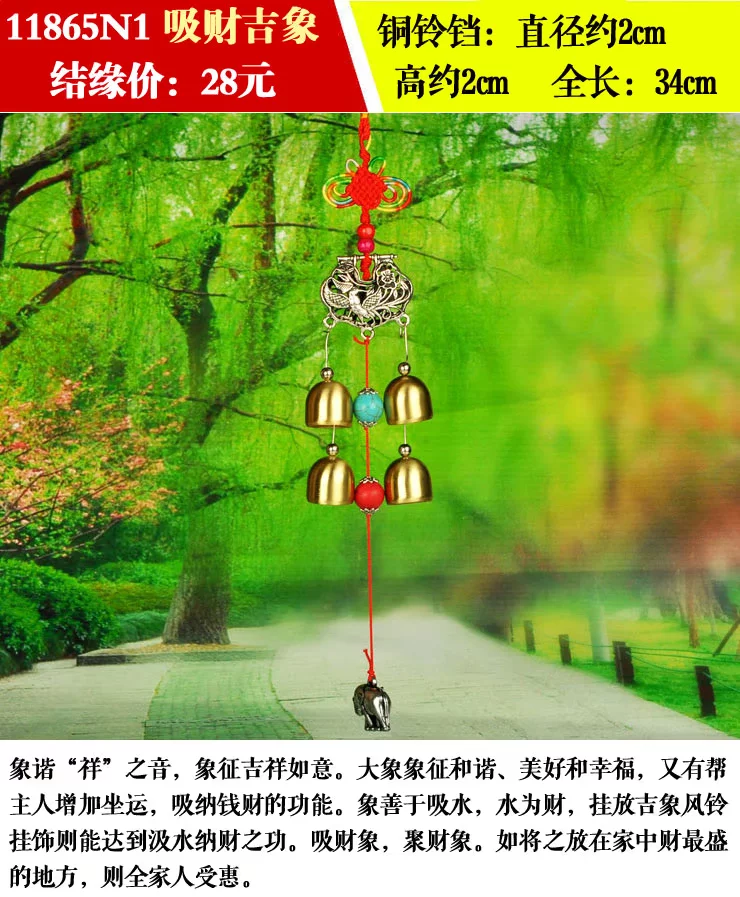 此款吉祥物,可摆放亦可吊挂,声音清脆悦耳令人身心舒畅,能消灾解难,驱除邪魔,化解煞气,招财引财.化煞为财,挂店门口事业顺利,财源广进,化解诸损害,属风水化解物,对阳宅有改变磁场,化解煞气,能让居家风水达到趋吉避凶之效果, 可招财,所以可安于财位或煞位,也可收藏在聚宝盆。 铜铃,小者为铃,大者为钟,具有避邪,化煞,保平安的作用,不管是铜铃还是铜钟,都具有招财化煞的效果。铜铃叮当作响,如同代您诵读了一遍佛经,功德无量。在风水中,铜铃铛的作用可克制五黄煞。凡流年五黄飞到的大门、房门,宜挂铜风铃化煞。因五黄煞属土,故挂属金的铜风铃可泄土气。铃铛摆动可加强金气,振起金气泄五黄土煞。 自古以来铜铃具有避邪,化煞,保平安的作用,不管是风铃还是铜钟,都具有招财化煞的效果但风铃化五黄煞的效果最好,其避邪、降魔、护宅、赐福的作用也很大, 铜铃和铜钟的声音,有降福驱邪的作用。也是风水师常用的物品。 |