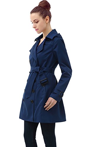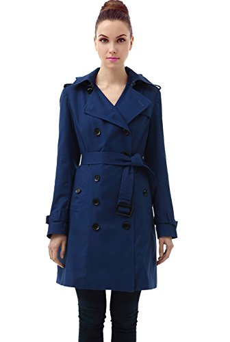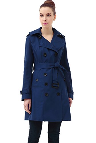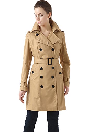 The classic double-breasted long trench coat features button-down gunflap, storm flap in back, epaulets, hook-and-eye collar, belted cuffs, and removable belt. A detachable hood gives an extra layer of weather protection.Feature