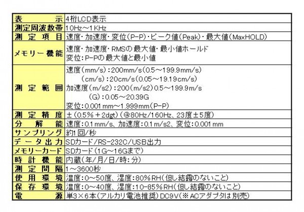 | SDカードにデータを保存し、パソコンに取り込むだけでエクセルでデータ編集が可能です。振動の速度と加速度・変位を測定します。実効値(RMS)・ピークホールド・MAXホールド機能付き。別売りのUSB/RS232Cインターフェースにも対応してます。 |