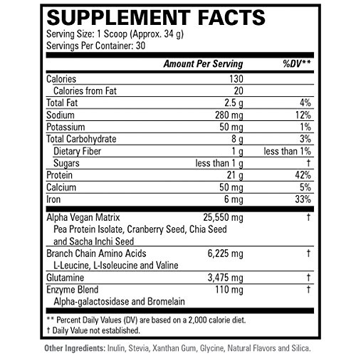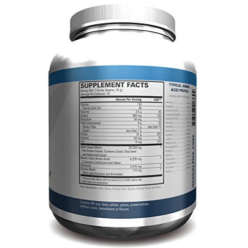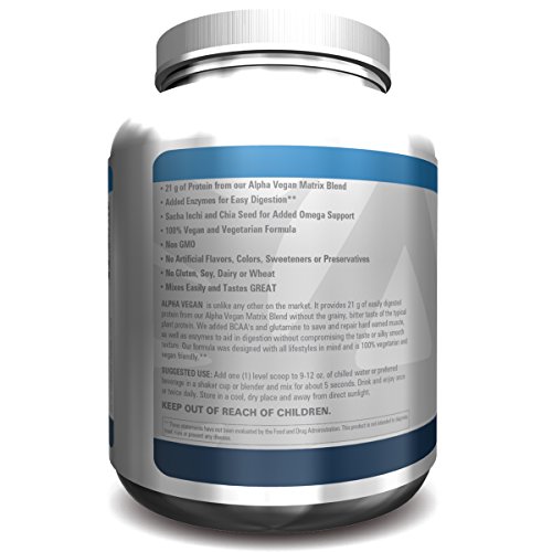 100% VEGAN AND VEGETARIAN FORMULA ALPHA VEGAN contains NO GLUTEN, SOY, DAIRY, OR WHEAT. It is virtually free of artificial flavors, colors, sweeteners & preservatives. Sachi inchi and chia seed have been added for essential omega support. This non-GMO plant protein mixes easily & tastes great.