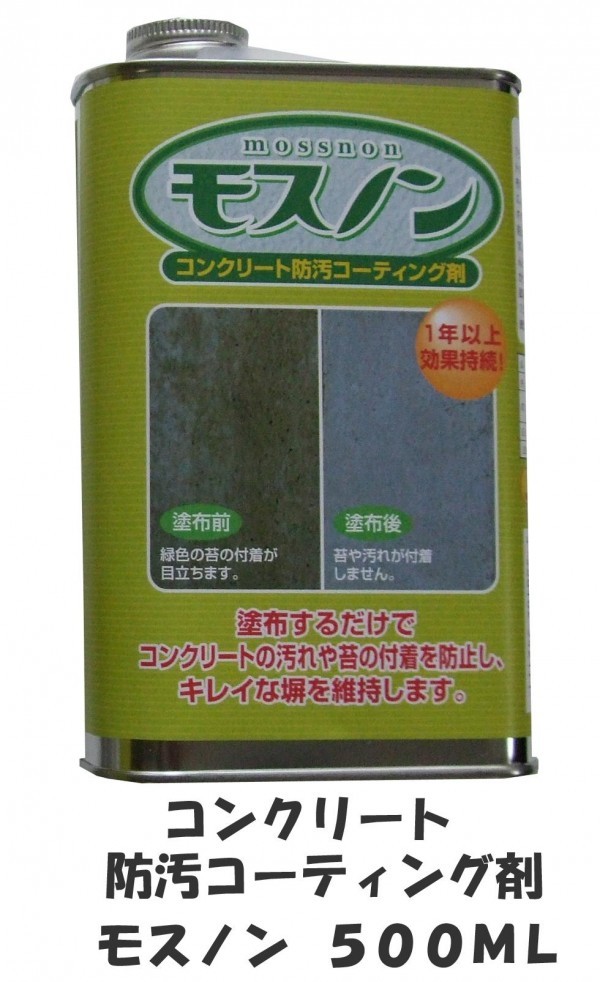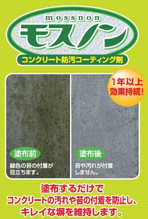 「モスノン」は、コンクリートの塀や自然石塀等に塗布することで、苔汚れや雨による窓枠下の黒ずみ汚れやサビ汚れ等の付着を防止するコーティング剤です。塗布面は見た目がほとんど変わらず、自然な仕上がりになります。 |